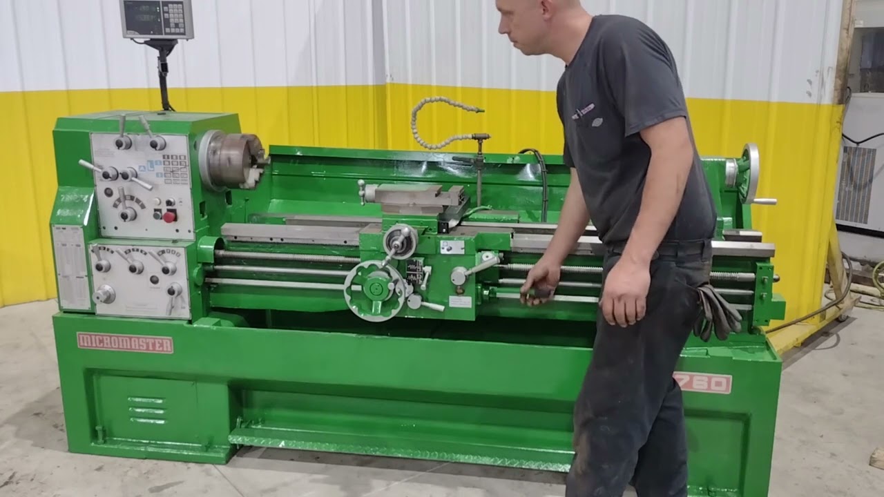 17" X 60" MICROMASTER MODEL #1760 ENGINE LATHE, 2-1/8" HOLE: STOCK #18165Swing over bed ............ 17 inchSwing over cross slide .... 11 inchSwing over gap ............ 24 inchDistance between center ... 55 3/4 inchSpindle nose .............. D1-6Spindle bore .............. 2 1/8 inchSpindle speeds ............ 12 speeds, 36-1850 rpmMain drive motor .......... 5 HPVoltage ................... 600vDRO ....................... Fagor model 20i-tSteady rest ............... Yes12 inch 3 jaws chuck