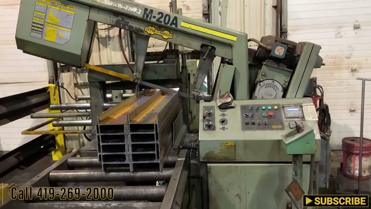 MODEL ........................... M-20AYEAR NEW ........................ 2000CAPACITY @ 90 DEGREES ........... 20" W X 30" HCAPACITY @ 45 DEGREES ........... 18" W X 20" HBLADE SPEEDS (VARIABLE) ......... 50 TO 350 SFPMBLADE SIZE ...................... 20'6" X 1-1/2"CUTTING FORCE ................... 0 TO 500 LBS.CLAMPING FORCE (VARIABLE) ....... 150 TO 900 PSIMAXIMUM WORK LOAD ............... 8000 LBS.SHUTTLE STROKE .................. 0 TO 33" (220" MAXIMUM)OPERATOR'S CONSOLE .............. DIGITAL ANGLE DISPLAYVISE & BLADE TENSION ............ HYDRAULICCHIP AUGER CONVEYOR ............. HYDRAULICMITERING ........................ POWERBUDDLE CUTTING .................. NESTINGPLC CONTROL ..................... 200COOLANT ......................... YESHYDRAULIC MOTOR ................. 3 HORSEPOWERBLADE MOTOR ..................... 10 HORSEPOWER