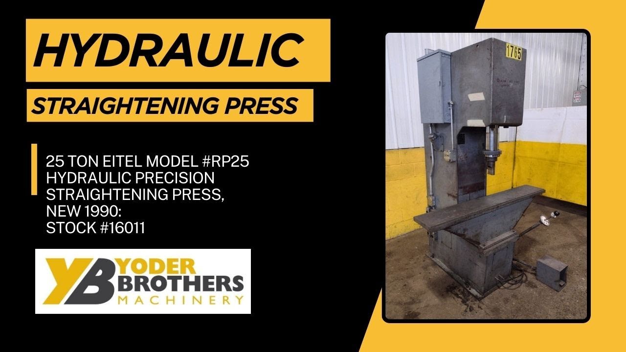 SERIAL ......................... 25549MODEL .......................... RP-25YEAR NEW ....................... 1990CAPACITY (METRIC) .............. 25 TONSCAPACITY (SHORT) ............... 27-1/2 TONSSTROKE ......................... 6"SHUT HEIGHT .................... 16"DAYLIGHT ....................... 34"RAM SPEED (DOWN) ............... 115 IPMRAM SPEED (UP) ................. 255 IPMTABLE .......................... 11" X 55"THROAT ......................... 10"FLOOR TO BED ................... 39-3/4"SINGLE HAND LEVER ACTUATION .... YES