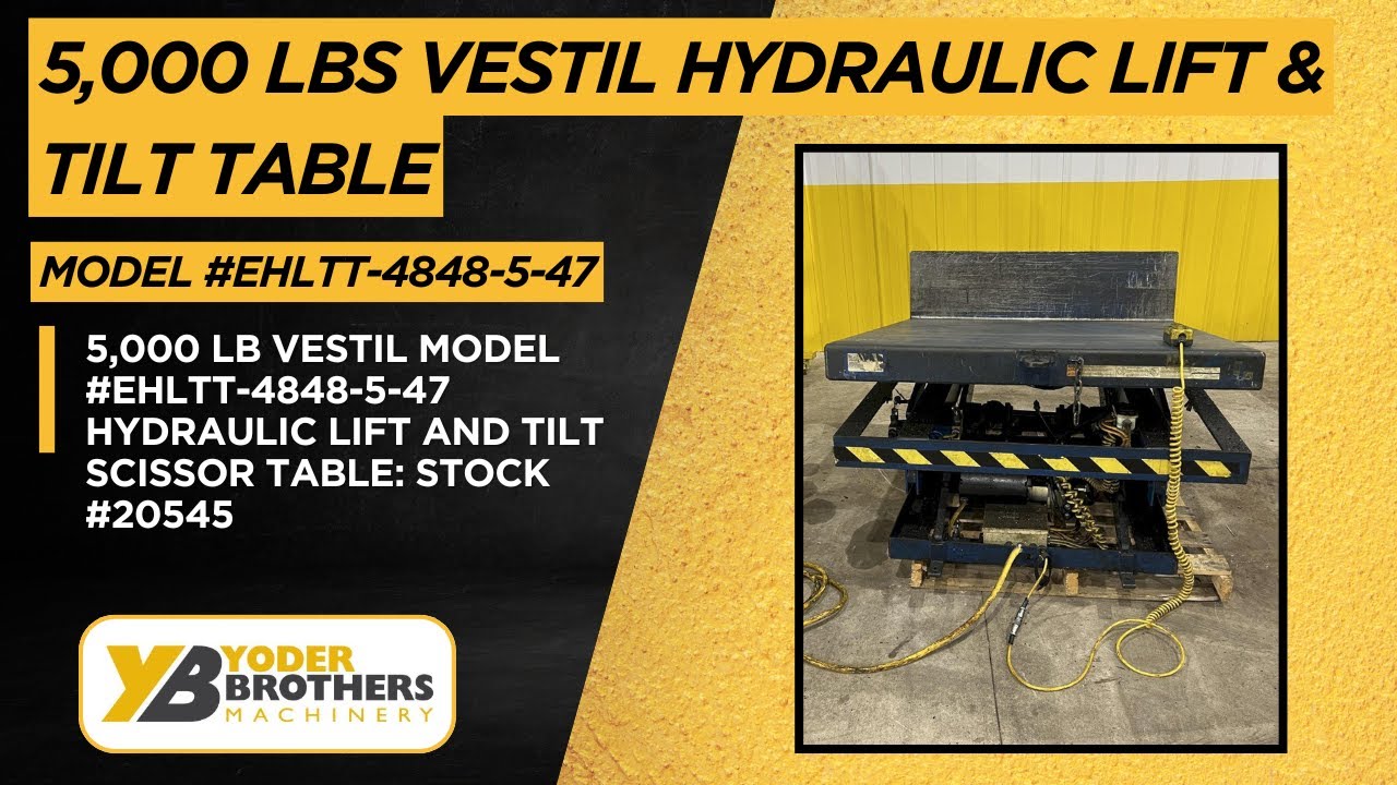 MODEL ................. EHLTT-48-48-5-47NEW ................... MAY 2012CAPACITY .............. 5,000 LBSPLATFORM .............. 48" X 48"LIFT .................. 36"LOWERED HEIGHT ........ 13"RAISED HIEGHT ......... 47"TILT .................. 45 DEGREESSTEEL CRADLE HEIGHT ... 12"SAFETY SKIRTINGMOTOR ................. 2 HP
