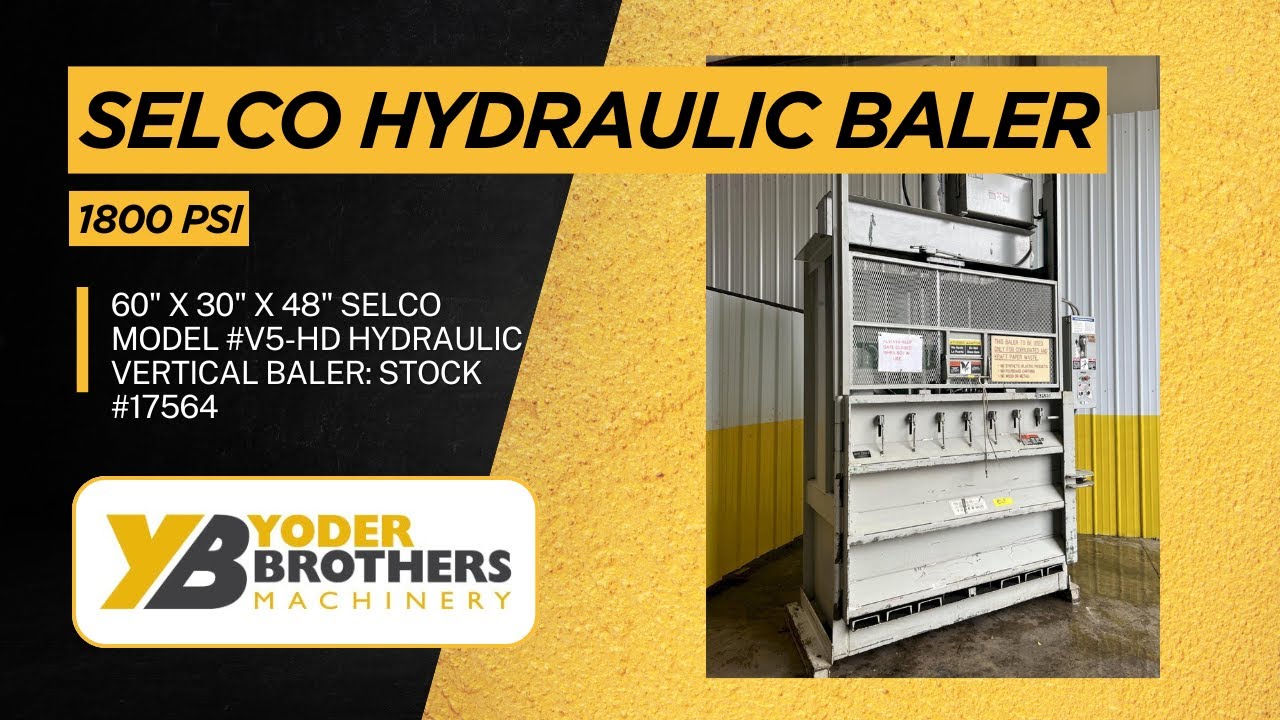 60" X 30" X 48" SELCO MODEL #V5-HD HYDRAULIC VERTICAL BALER: STOCK #17564SERIAL ................ 08893887MODEL ................. V5-HDBALE SIZE ............. 60" W X 30" D X 48" HBALE WEIGHT ........... 1100 LBS MAXBALE CYCLE TIME ....... UP TO 50 SECONDSFEED OPENING .......... 60" X 27"RAM STROKE ............ 48"HYDRAULIC PRESSURE .... 1800 PSIHYDRAULIC CYCLINDER ... 6" BOREHYDRAULIC MOTOR ....... 15 HPMACHINE WEIGHT ........ 4300 LBS