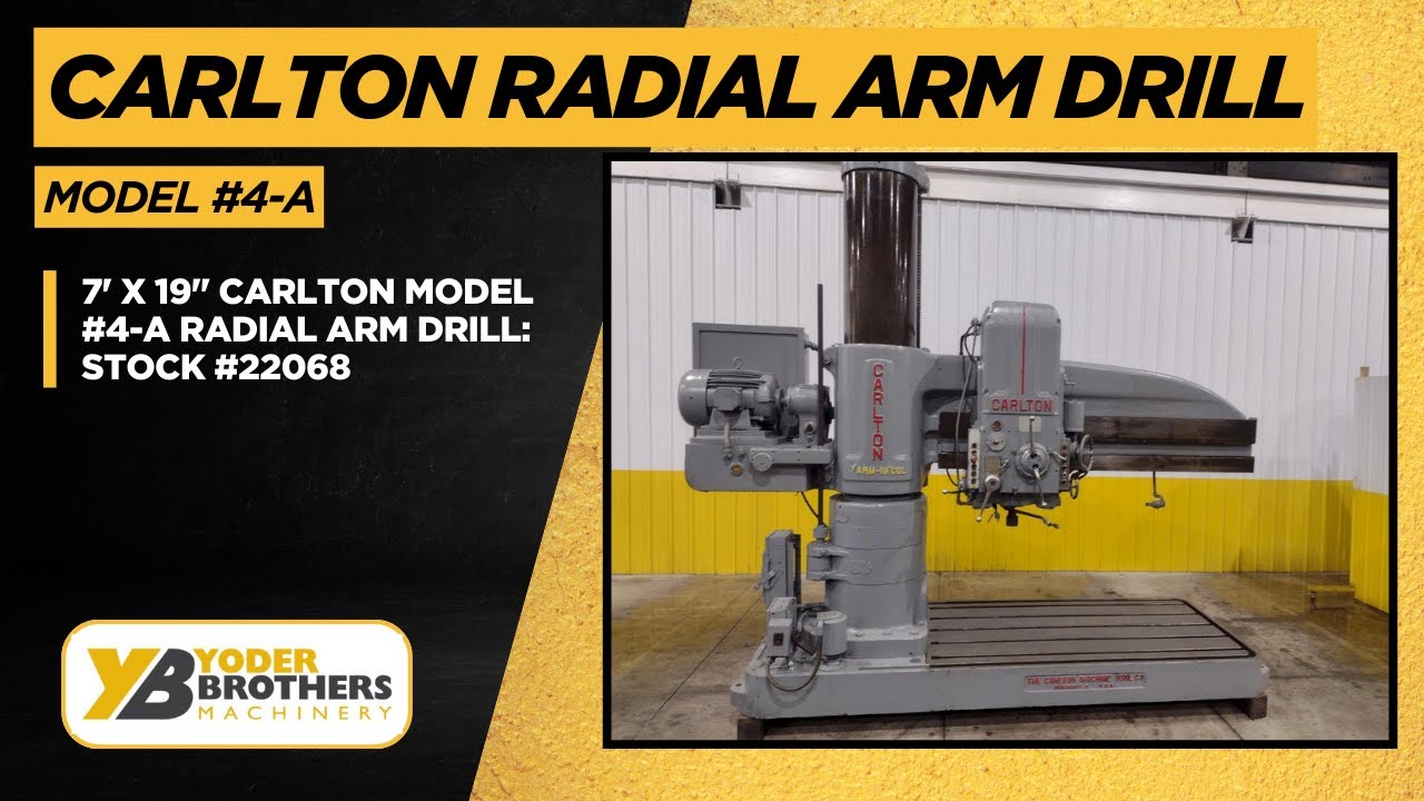 SERIAL ......................... 4A 4979MODEL .......................... 4AARM LENGTH ..................... 7'COLUMN DIAMETER ................ 19"AREA OF BASE (T-SLOTTED) 77" X 50"SPINDLE SPEEDS (36) 12 TO 1200 RPMSPINDLE FEEDS (18) .004 TO .125 IPRTAP LEADS 8 / 11-1/2 / 14 / 18 TPIDISTANCE SPINDLE TO BASE 14-1/2" MINIMUM TO 78" MAXIMUMDISTANCE SPINDLE TO COLUMN 13-1/4" MINIMUM TO 84" MAXIMUMSPINDLE TRAVEL 20"DIAMETER OF SPINDLE 4"TAPER IN SPINDLE #6 MTPOWER CLAMPING YESPOWER ELEVATION YESPOWER HEAD TRAVERSE YESCOOLANT YESMOTOR 20 HORSEPOWER
