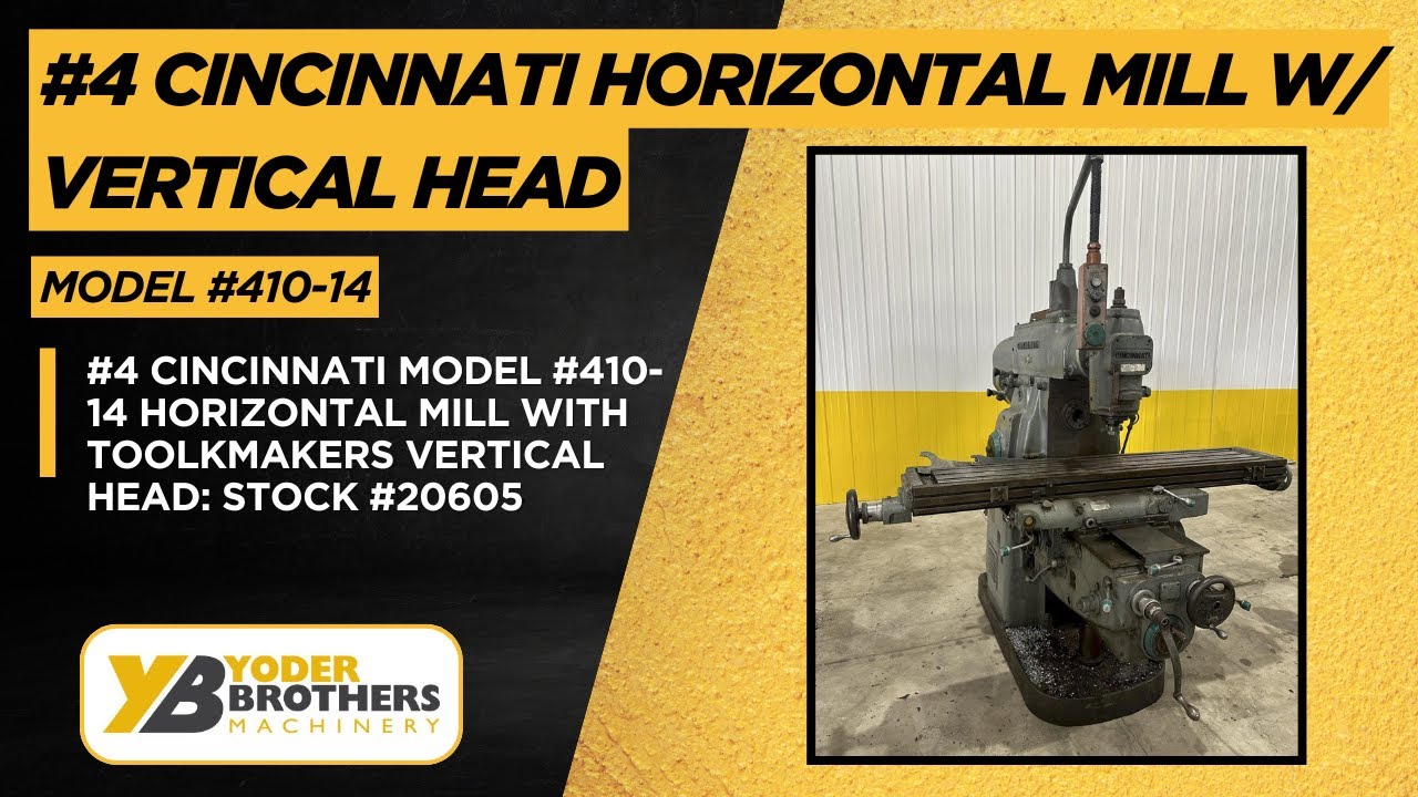 #4 CINCINNATI MODEL #410-14 HORIZONTAL MILL WITH TOOLKMAKERS VERTICAL HEAD: STOCK #20605SERIAL .......................... 2J4P5H-2MODEL ........................... 410-14AREA OF TABLE ................... 70-1/2" X 14"SPINDLE SPEEDS .................. (16) 33 TO 2000 RPMLONGITUDINAL & CROSS FEEDS ...... (16) 1/4 TO 30 IPM (3 TO 380 MMPM)VERTICAL FEEDS .................. (16) 1/8 TO 15 IPM (1.5 TO 190 MMPM)LONGITUDINAL TRAVEL ............. 42"CROSS TRAVEL .................... 12"VERTICAL TRAVEL OF KNEE ......... 19"CENTER LINE OF SPINDLE TO TABLE . 0" MINIMUM, 19" MAXIMUMTABLE SWIVELS, LEFT OR RIGHT .... 46 DEGREETAPER IN SPINDLE ................ #50 NSRAPID TRAVERSE .................. 150 IPM (75 IPM VERTICAL)MAIN MOTOR ...................... 7.5 HORSEPOWER