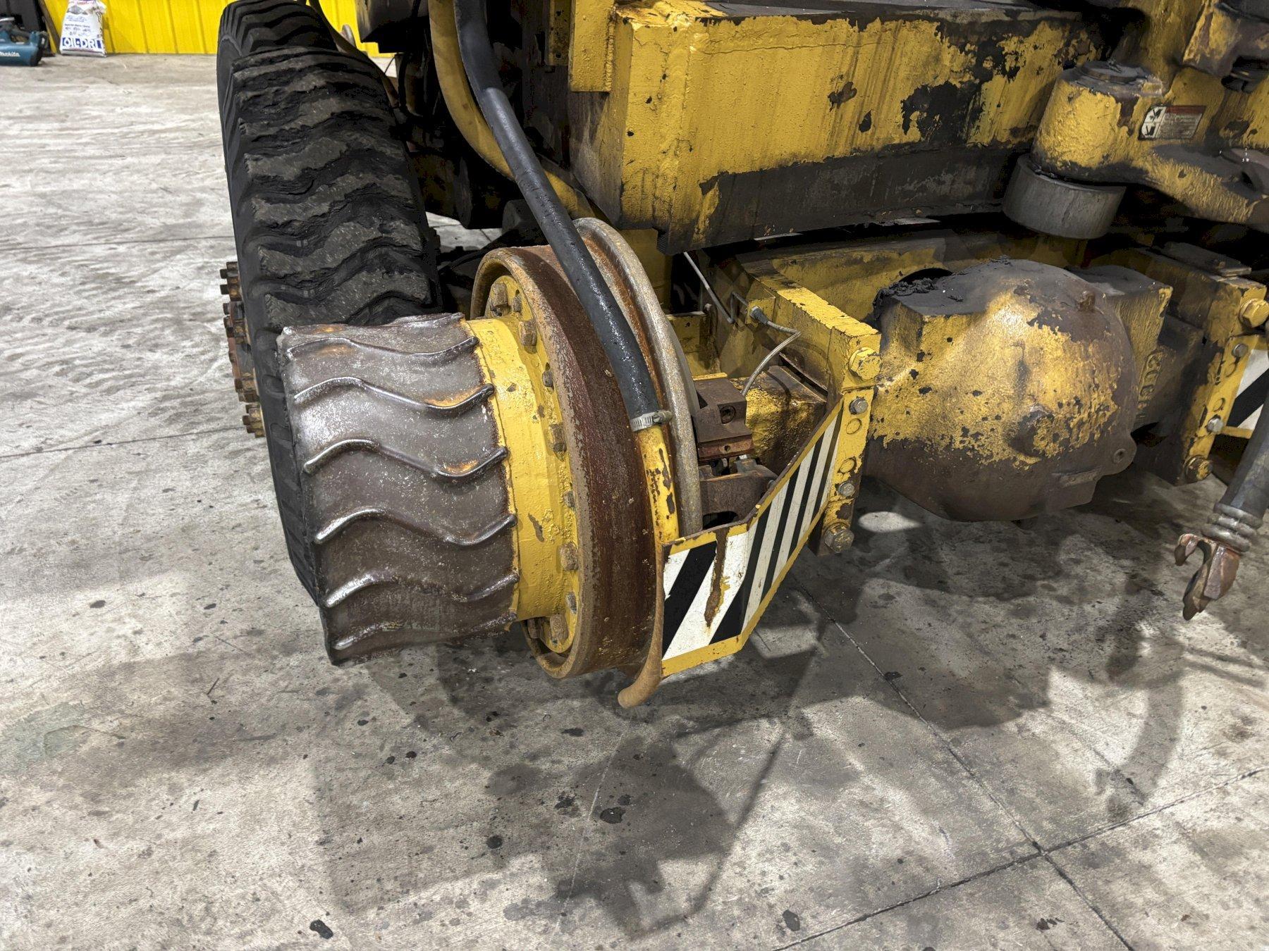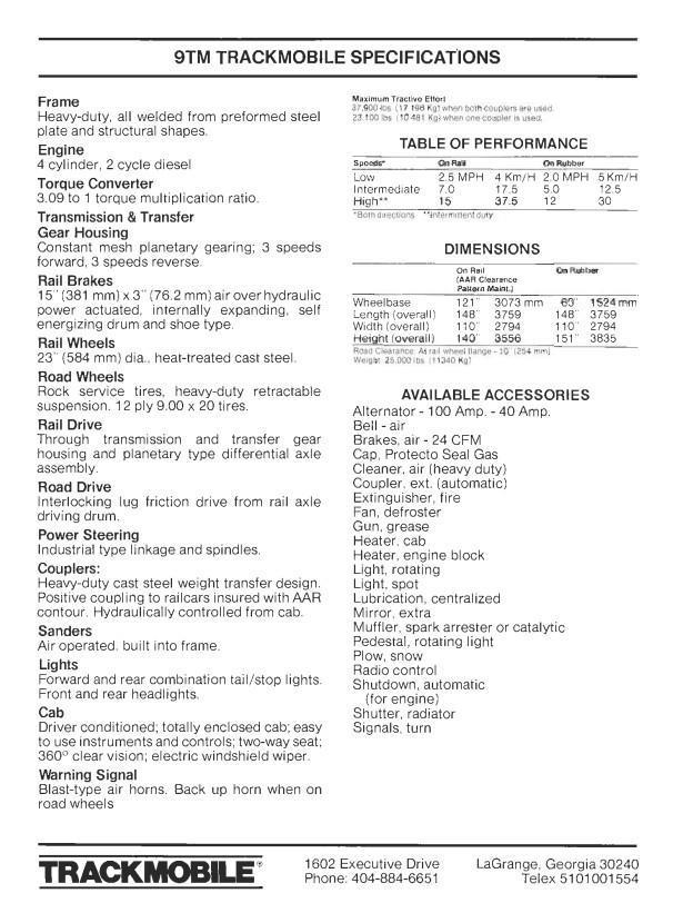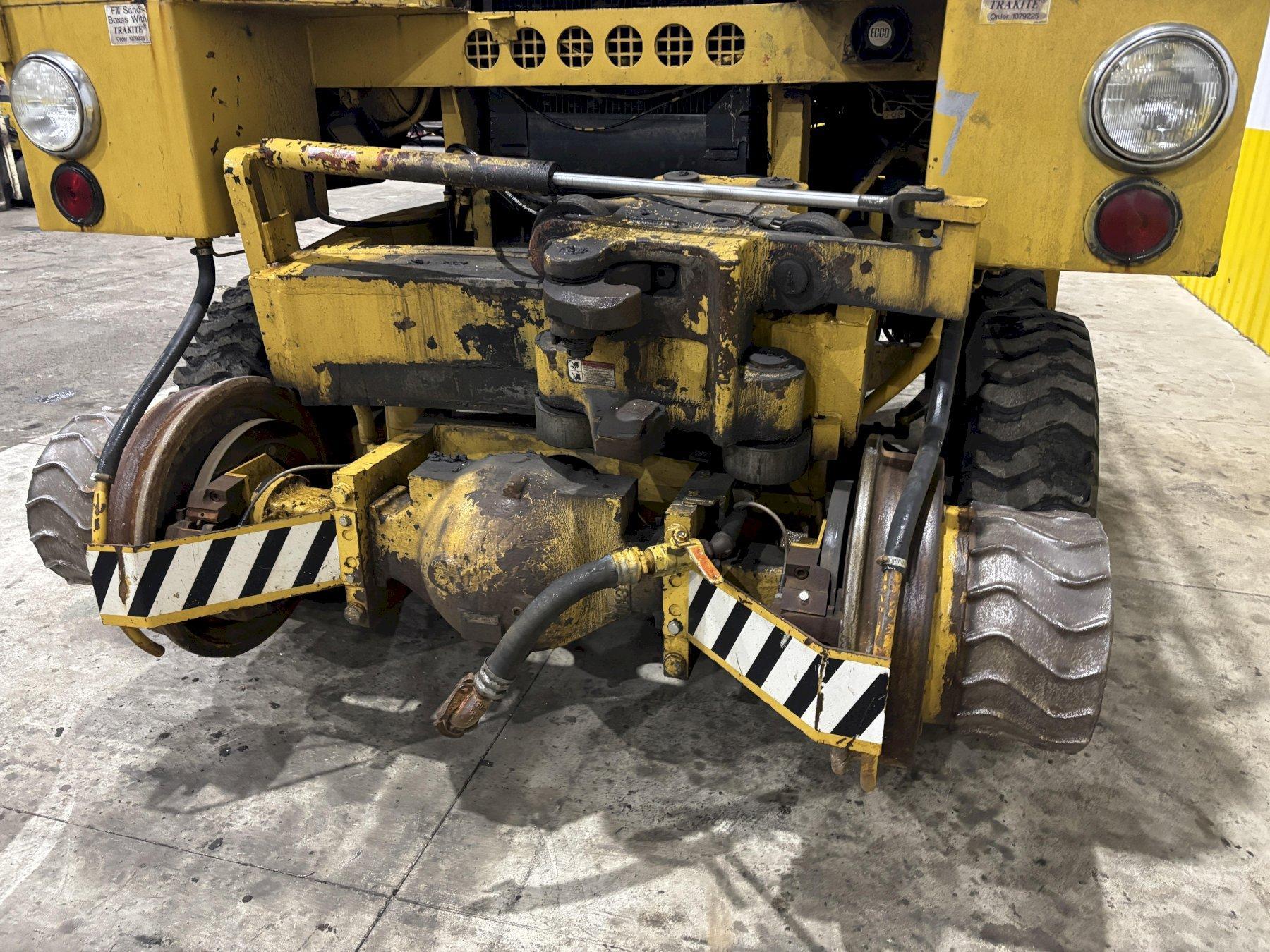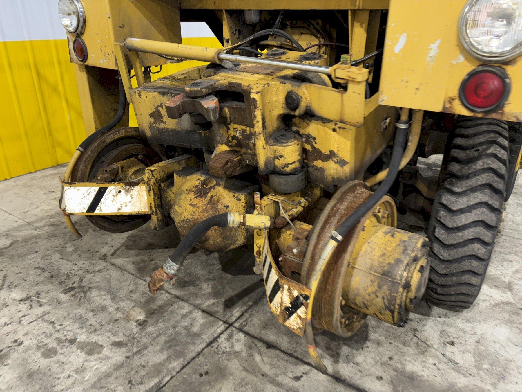FRONT & REAR COUPLERS .. WEIGHT TRANSFER DESIGN, HYDRAULIC CONTROLRAIL WHEEL DIAMETER .... 23"ROAD WHEELS ............ 9.00 X 20ROAD WHEEL SUSPENSION .. RETRACTABLESPEEDS ON RAIL ......... 15 MILES PER HOURSPEEDS ON ROAD ......... 12 MILES PER HOURTRACTION ON RAIL ....... 36,000# @ 2-COUPLERS, 22,000# @ 1-COUPLERTORQUE CONVERTER ....... 3.09 TO 1 TORQUE MULTIPLICATION RATIO